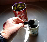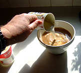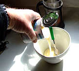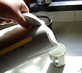 Push the plunger on the cafetiere, and pour out one cup of brewed coffee. Add it to the milk in the mixing bowl Then add half a cup of single cream, and stir the whole lot until mixed well. | ![]() |
