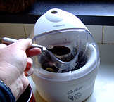 If you do not have a machine, add the teaspoonful of ground coffee to the chilled mixture, stir well, then freeze. If possible, use a metal bowl as the mixture will freeze quicker. Remove the bowl from the freezer once every hour and whisk the mixture to prevent ice-crystals forming. You will probably need to do this about 5-6 times. This works nearly as well as using a machine but you've got to remember to whisk it! |